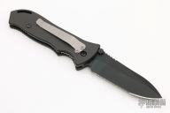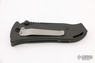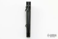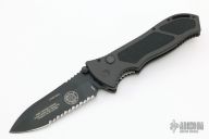 This Point Man Auto from Masters of Defense features a black coated spear point blade with swedge, notched thumbrest, dual thumbstuds and partially serrated edge. The handle is comprised of black anodized aluminum with non slip inlays on the "A" side over an inlaid steel lockbar. Black stainless steel tip down clip. Lanyard hole in pommel. Excellent condition. Comes with black nylon sheath.