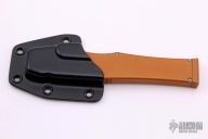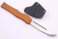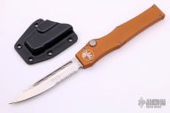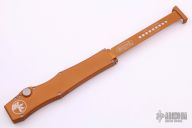 This Halo V OTF automatic has a stonewashed blade with a partially serrated edge. Orange aluminum handle. Comes with original box, papers and kydex sheath.  Dated 09/2014 and S/N 07447.  Light scuffs are visible on the handle otherwise the knife is in excellent condition.