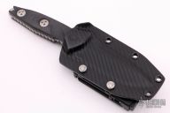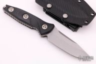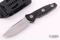 This Mini Socom Alpha by Microtech features a stonewashed drop point blade with a notched thumb ramp and a full tang construction. .162" Blade Stock. 1.151" Blade Depth. The handle features black G10 scales. Includes a kydex sheath with a Tek-lok. Dated 08/2019.  S/N 036. Excellent Condition.