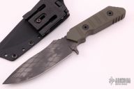 This D-AL by Duane Dwyer features a razor wire finished blade with notched thumbrest, .264" blade stock and 1.650" blade depth, full tang construction. The handle has green G-10 scales. Comes with a kydex sheath. Has some sheath marks on the finish, otherwise excellent condition.