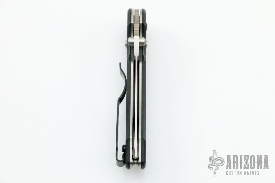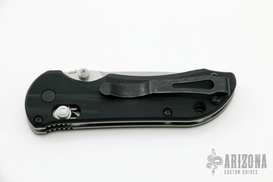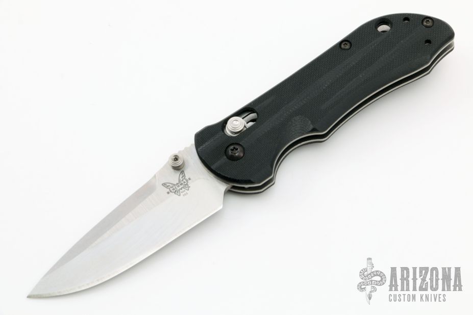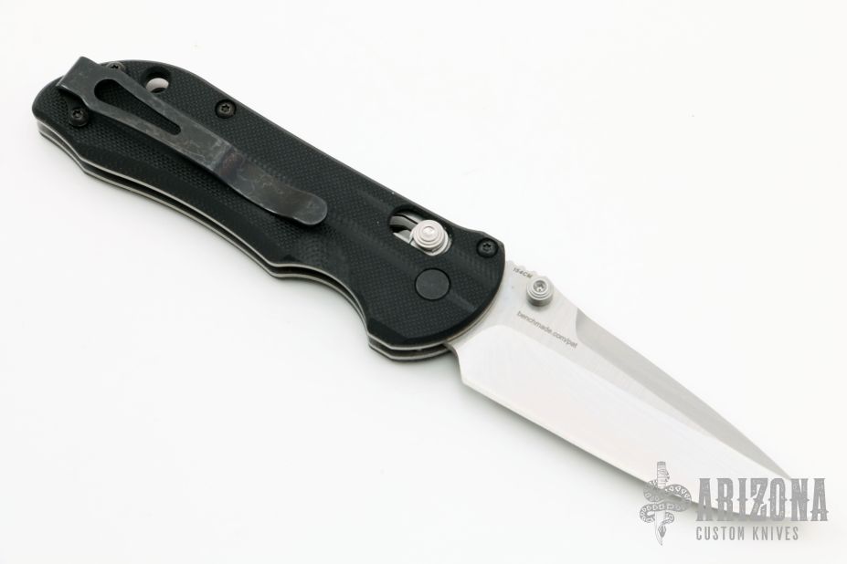 This is a Benchmade mini stryker features a satin drop point blade with dual thumb studs and a notched thumbrest. The handle features black G10 scales over steel liners and a black tip up pocket clip.  Includes the original box and papers.  Excellent Condition.