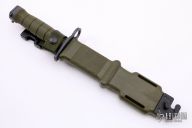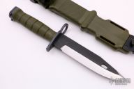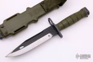 The M9 Bayonet by Tri-Technologies was reground by Borka Blades. It has a black blade with satin grinds, sawteeth on the spine and hole in the blade that corresponds with the tab on the sheath to act as a wire cutter, .231" blade stock and 1.400" blade depth, hidden tang construction. The handle has a steel guard and butt with green nylon grip. Comes with original sheath. Excellent condition.