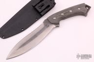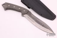 This Bolo by Steve Ryan features a double edged blade with a notched thumbrest and a partially serrated top edge, .219" blade stock and 1.893" blade depth, full tang construction. The handle has black canvas micarta scales. Comes with a kydex sheath with TekLok. Excellent condition.