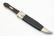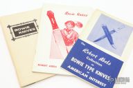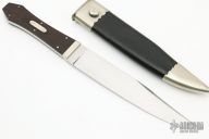 This Bowie by David Shaw, who was one of Buster Warenski's apprentices, features a hand rub satin finished blade with false top edge, .188" blade stock and 1.352" blade depth, full tang construction. The handle has nickel silver bolsters, escutcheon and pins, Brazilian Rosewood scales. Comes with a black leather sheath with nickel silver fittings. Excellent Condition. Comes with a zippered case and 3 very hard to find Robert Abels Antique Bowie Knife books.