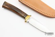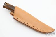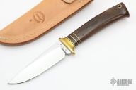 This Hunter by R.W. Wilson features a mirror polished drop point blade with .159" blade stock and 1.024" blade depth, hidden/frame tang construction. The handle is comprised of a brass guard, brass, black fiber and camel bone spacers with camel bone scales over a brown canvas micarta frame. Includes leather sheath with belt loop. Excellent condition.