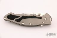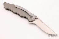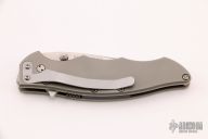 This Whisper 1625 (40 of 250) assisted opening flipper has a satin finished CPM440V stainless steel blade with dual thumb studs (thumb stud lock) and notched thumb rest. Handle is bead blasted titanium with non-slip inserts. Safety located above spacer spine. Bead blasted stainless steel tip down clip. New/Excellent condition. Comes with original box, zippered case and papers. Also comes with a display stand.