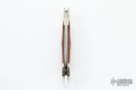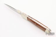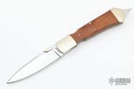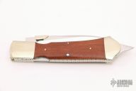 This Lockback features a mirror polished blade with dual pinned nickel silver thumbstuds. The handle has dovetailed nickel silver bolsters, pink ivorywood scales, fileworked nickel silver liners, stainless steel backspacer with skull crusher at the butt. Nice lockup and blade seating. Comes with a zippered case. Excellent condition.