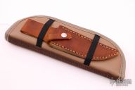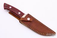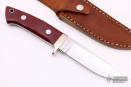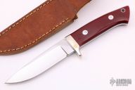 This Drop Point Hunter by Steve Voorhis has a mirror polished drop point blade with full tapered tang. Blade width is .171", depth 1.091". Handle has a nickel silver single guard, red G-10 scales and black liners, lanyard hole at the butt. Comes with a brown leather sheath and a zippered case. Excellent condition.