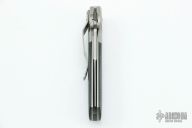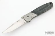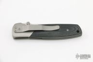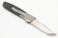 This knife by Joel Chamblin features a hand rub satin finished drop point blade with notched thumbrest and dual checkered thumbstuds. The handle has bead blasted and dovetailed titanium bolsters, black G-10 scales, bead blasted titanium liners, black G-10 backspacer, tip down bead blasted titanium clip. Excellent condition.