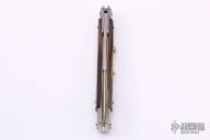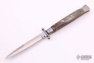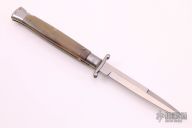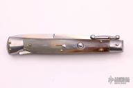 This 11" Swing Guard Auto by Frank Beltrame features a polished dagger/bayonet ground blade with false top edge. The handle has stainless steel bolsters, front and rear, honey horn scales, brass liners, stainless spring. Has some light scratches, otherwise excellent condition.
