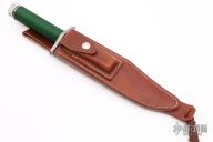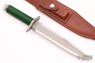 This Lile Cerakote Series First Blood Knife by Vaughn Neeley is a Series C and #023, it features a two tone blade with Titanium Grey Cerakote center and mirror polished grinds, sharpened top edge and 14 saw-teeth on blade spine, .259" blade stock and 1.477" blade depth, hidden tang construction. The handle has a Titanium Grey Cerakote stainless steel double guard with flat and Phillips head screw drivers, hollow cord wrapped handle, and aluminum removable butt cap with an O-ring to make it water-proof. Comes with brown leather sheath that has a honing stone in the sheath. Has compass in butt cap. The blade is stamped "C Series 023" Designed by Jimmy Lile and made by Vaughn Neeley. Excellent/new condition, the knife has never been in the sheath. Comes with zippered case and COA dated 08/2020.