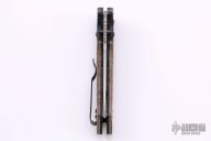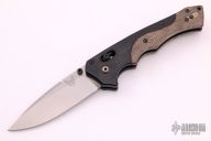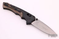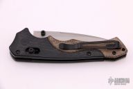This 615 Mini-Rukus is a Neil Blackwood design executed by Benchmade. It features a drop point blade with swedge, dual thumb studs and notched thumbrest. The handle is comprised of black G10 bolsters and brown canvas micarta scales over black coated steel liners and barrel spacers. The black coated deep carry clip is reversible for left or right hand, tip up carry. Includes original drawstring pouch, paperwork and box. Excellent condition. First Production Run #54 of 1000. Comes with an extra clip.