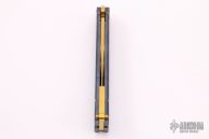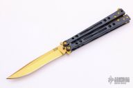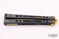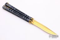This Specter Elite Balisong from Jerry Hom features a gold satin finish recurve blade with swedge. The handle is comprised of blue titanium handles with gold satin titanium backspacers and T latch. Includes original box and paperwork. Excellent condition.