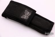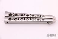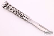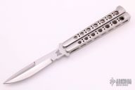 This early balisong from Pacific Cutlery features a Jody Samson ground satin finished blade with sharpened top edge. The handles are stainless steel with hole pattern. Has a few light scratches, otherwise excellent condition. Includes original nylon sheath.