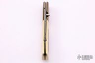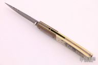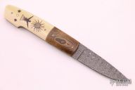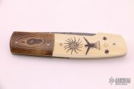 This linerlock by Stan Fujisaka features a Damascus blade with a single thumbstud. The handle has dovetailed mokume bolsters, mammoth ivory scales with scrimshawed by Linda Karst-Stone.  Opposite side ivory has Native American characters.  Gorgeous piece. Signed on the inside of the backspacer with "Fujisaka 2007". Excellent condition. Comes with a zipper case. Nice detent, lockup and blade seating.