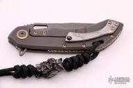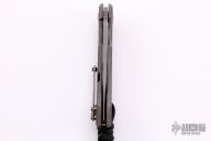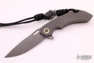 This Wayfarer 247 from Olamic Cutlery features an acid tumble finished blade with swedge, thumbhole, notched thumb rest and flipper. The titanium handle scales are bead blast finished titanium with a Damasteel pocket clip is positioned for tip up carry with a ceramic ball inlay, floating carved and anodized titanium backspacer. The Wayfarer 247 is very comfortable in the hand and flips well with no wrist action needed. Blade is centered when closed and locks up with no play. Comes with zippered case and maker's card with a serial number of T1501 and dated 5-12-21. Has some light scuffs, otherwise excellent condition.
