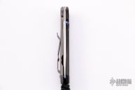 This small Sebenza 21 by Chris Reeve Knives is a KnifeArt.com Exclusive. It features a tumble finished tanto blade and bead blast titanium frame with carbon fiber front scale. Lanyard pin, lanyard and ring spacer bead on pommel. Includes original box and paperwork dated January 13, 2020. Knife is in Excellent condition, shows no signs of use/carry.