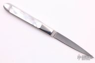 This interframe lockback by Judy Gottage features a hand rub satin finished blade with nail nick, it is marked "Judy Gottage Maker" on the blade as well as "No. 1". The handle has a mirror polished stainless steel frame, mother of pearl inlays, and a stainless steel spring. The handle has no exposed hardware. Has some light scratches otherwise good condition. Judy's knives don't come up for sale very often. This knife does not close!!