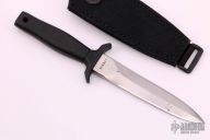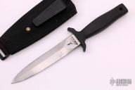 This Mark 1 dagger by Gerber is double-edged with satin finish, .244" blade stock and .933" blade depth, hidden tang construction. Black coated aluminum handle. Comes with black nylon sheath with belt/boot clip. #076955. Has some scratches and a couple oxidation spots, otherwise good condition.