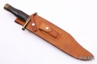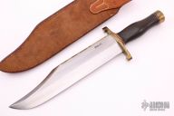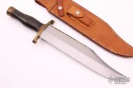 This Model 12-11 Smithsonian Bowie by Randall Made Knives features a satin finished carbon steel blade with sharpened top edge and brass parry guard, .294" blade stock and 2.213" blade depth, hidden tang construction. The handle has a lugged brass guard and butt, black linen micarta grip with red/white/blue spacers. Comes with a brown leather sheath. Has some patina, otherwise excellent condition.
