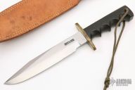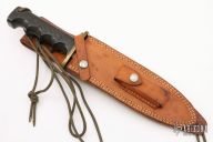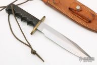 This model 14 by Randall Made Knives features a satin finished blade with sharpened top edge, .219" blade stock. 1.365" blade depth, full tang construction. The handle has a brass guard, black linen micarta handle with a lanyard hole at the butt. This knife was designed to meet the demand for an almost indestructible all-purpose knife, though it is especially suited for combat and survival purposes. Comes with brown leather sheath. Has some light oxidation spots and patina, otherwise good condition.