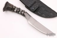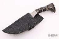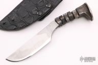 This Railroad Spike Knife features a hand forged satin finished blade with 1.118" blade depth, integral construction. Comes with a leather over kydex sheath and a zippered case. Has some light scratches and patina on the blade, otherwise excellent condition.