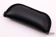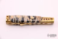This side opening Auto by Merlin Knives features a mirror polished blade. The handle has engraved brass bolsters with ruby inlays, mammoth tooth scales, fileworked brass liners and gold plated stainless steel backspacer. Nice blade seating and action. Has some blade play when open. Has some light scratches, otherwise good condition. Comes with a zippered case.
