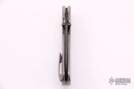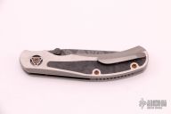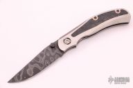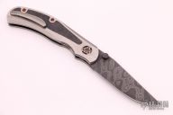 This Custom Groomsman II by Brad Southard features a Chad Nichols Stainless Damascus blade with dual zirconium thumbstuds and a notched thumbrest. The handle has a two-tone titanium frame with marble carbon fiber inlays, scratch pattern zirconium backspacer with dimples, titanium pivot ring, tip up bead blasted titanium clip with hidden screws, anodized titanium handle screws. Nice detent, lockup and blade seating. Comes with original box with plaque dated 2019. New condition from the Monkey Muster.