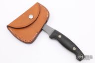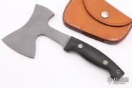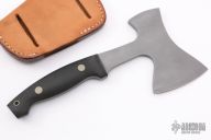 This hatchet by the Late Jimmy Lile features a bead blasted blade with hammer pole, .300" blade stock and a 3" cutting edge, full tapered tang construction with black linen micarta scales and nickel silver pins. Comes with a brown leather belt sheath. Has a couple very light scuffs, otherwise excellent condition.
