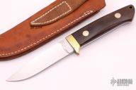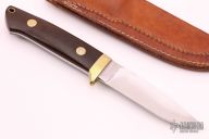 The classic Drop Point Hunter that made Bob Loveless designs so famous. Satin finished drop point blade with full tapered tang construction, .166" Blade Stock .936" Blade Depth. The handle has a brass guard and brown canvas micarta scales with red liners, lanyard hole. Comes with a brown leather sheath. Has some light scratches, otherwise excellent condition. Comes with a zippered case.