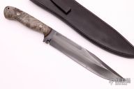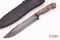 This G3 Fighter by Barry Dawson features a clip point blade with a nice hamon, false top edge, fileworked blade spine, fullers and notched thumbrest, .243" blade stock and 1.483" blade depth, full tang construction. The handle has maple burl wood scales with mosaic pins. Comes with a black leather sheath. Excellent condition. Comes with a zippered case.