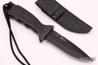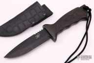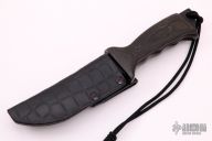 This Pathfinder by Scorpion Knives features a black blade with false top edge and notched thumbrest, .203" blade stock and 1.376" blade depth, full hidden tang construction. The handle has black linen micarta grip with extended tang and lanyard hole. Comes with a black leather over kydex sheath and original box. Excellent condition.