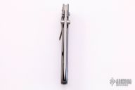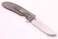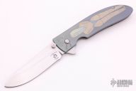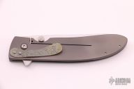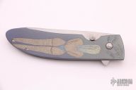 This Bikini flipper by Ross K Mitsuyuki features a hand rub satin finished drop point blade with dual thumbstuds and a flipper. The handle has an anodized titanium frame with a tip down engraved and anodized titanium clip and black G-10 backspacer. The handle has anodized engraving of a topless woman's backside with a bikini on. Rides on bearings, nice lockup and blade seating. New from maker. Comes with a zippered case and a hand written COA.