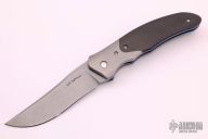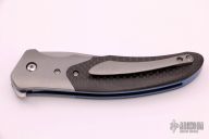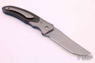 This Crux Kickstop Flipper by Lee Williams features a tumble finished blade with false top edge and kickstop flipper. The handle has orange peel finished titanium bolsters, carbon fiber scales, anodized titanium liners and textured backspacer, with orange peel finished titanium tip up clip. Rides on bearings, nice detent, lockup and blade seating. Comes with a zippered case. Excellent condition.