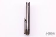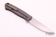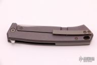 This Arsen framelock flipper by KD Knives features a hand rub satin finished blade with a flipper. The handle has a tumbled and anodized titanium frame with a blasted and anodized titanium backspacer and tip up clip. Rides on bearings, nice detent, lockup and blade seating. Comes with original wooden box and COA dated 9-6-21. Excellent condition.