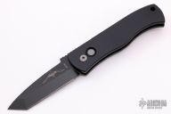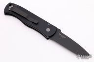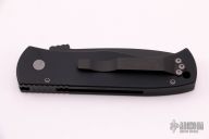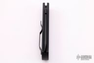 This Emerson/Pro-Tech CQC7 automatic has a chisel ground black DLC finished blade with a plain edge and a solid black aluminum handle. Black stainless steel clip. Coil spring. New from Maker