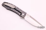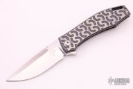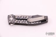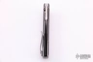 This KMP22 Frame Lock Flipper by Charles Marlowe features a satin finished blade with flipper. The handle has a milled and two-tone anodized titanium frame with black G-10 backspacer and tumbled titanium tip up clip. Rides on IKBS, nice detent, lockup and blade seating. Excellent condition. Comes with a zippered case.