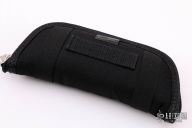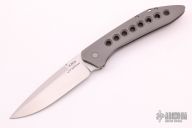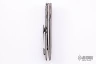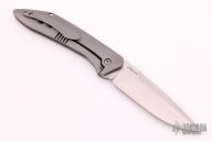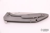 This Donk by Lee Williams and Tom Mayo features a hand rub satin finished blade with false top edge and kickstop flipper. The handle has a bead blasted titanium frame with matching tip up clip. Rides on bearings, nice detent, lockup and blade seating. Comes with a zippered case. Has a couple very light scuffs, otherwise excellent condition.