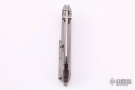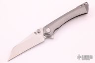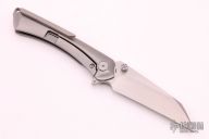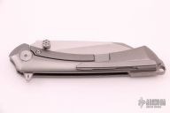 This H1 by YelloHamma features a satin finished blade with dual thumbstuds and notched flipper. The handle has a milled and tumbled titanium frame with matching backspacer and tip up clip with hidden screws. Rides on bearings, nice detent, lockup and blade seating. #095. Excellent condition.