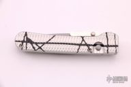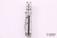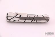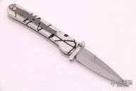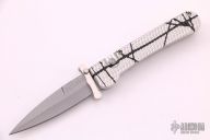 This side-opening automatic by Rob Dalton features a bead blast blade with swing guard and an anodized silver and black aluminum frame. Bead blast titanium clip. Push button coil spring opening. Excellent condition. #040