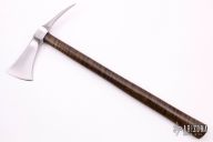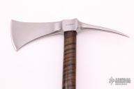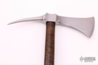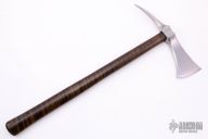 This custom made spike hawk by Master Smith Joe Flournoy features a satin finished head with a 3" blade length and a 4" spike on the opposite side. 19" overall length. Nice curly maple handle. Has a couple light scratches, otherwise excellent condition.