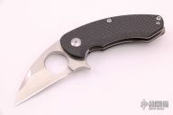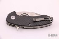 "The Silent Soldier Flipper features a satin finished steel blade with a Wharncliffe style profile. The blade has a double ground, double swedge. The spine has aggressive thumb jimping and a 7/8" finger hole in the blade for ultimate control with various grip styles. The pivot utilizes a ball bearing system and heat treated pivot and stop pin. The handle has 6al4v titanium liners, carbon fiber scales. Bead blast finished stainless steel back spacer and pocket clip" Flipper opening mechanism. Comes with original box and papers #25 of 500. Has a few scratches, otherwise excellent condition.