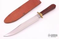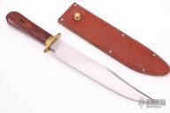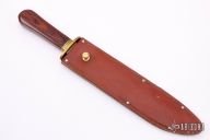 This Laredo Bowie by Cold Steel features a satin finished blade with sharpened top edge, .290" blade stock and 1.576" blade depth, hidden tang construction. The handle has a brass guard and dymondwood grip. Comes with brown leather sheath and original box. Has some light scratches and patina, otherwise good condition.