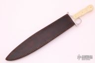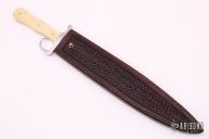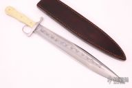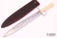 This Laserre Bowie by Journeyman Smith Craig Camerer is a recreation of a Historical Bowie from the 1840-50s. It features a spear point blade with sharpened top edge, nice hamon and wide fullers, .172" blade stock and 2.043" blade depth, frame/hidden tang construction. The handle has a stainless steel guard with integral ring and frame tang, stabilized giraffe bone scales, nickel silver domed pins. It comes with a beautiful hand-tooled brown leather sheath with a belt stud. It comes with a zippered case. Excellent condition.