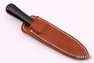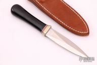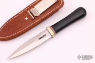 This Model 24 Guardian by Randall Made Knives features a satin finished double-edged blade with notched finger rests, .110" blade stock and .840" blade depth, hidden tang construction. Black linen micarta grip with red/white/blue spacers and a nickel silver guard. Both edges of the blade are sharpened with 1" of thumb notches. This model was designed in 1978 for use by police, undercover agents and law enforcement personnel for self-protection and as a back-up weapon. Comes with a brown leather sheath w/ boot clip. Excellent condition.