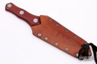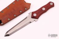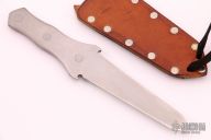 This Light Dagger by Phill Harsfield features a double edged chisel ground blade, .125" blade stock and 1.118" blade depth, full tang construction. The handle has a wood scale. Comes with a paper lined, brown leather covered metal sheath. Excellent condition.