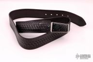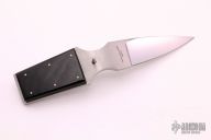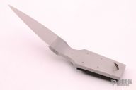 This integral knife has a mirror polish blade and a satin finish handle with a black micarta scale. .208" thickness. The knife can be sheathed in the included leather belt with the scale showing as the belt buckle. Size 42" to 46" belt. Very nice work, Excellent condition.