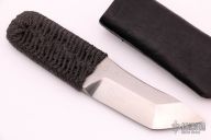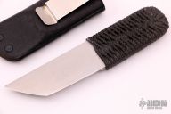 This Small Kwaiken by Phill Hartsfield has a chisel ground tanto blade with a swedge and a black cord wrapped handle, .243" stock and 1.240" depth, hidden tang construction. Original sheath. Fine example of Phill Sr.'s work. Excellent condition.