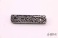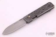 Serge Panchenko has created a unique style over the years. His designs and finishes are recognizable at first glance. It features a Stainless Steel handle with a titanium liner lock and a D2 steel blade. This knife has been expertly engraved by Tom Sterling and has 24kt gold inlays. Comes with a COA from Tom Sterling, original box and papers. New from maker. Very cool!