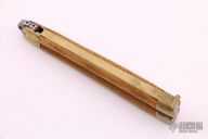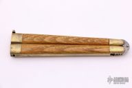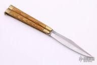 This balisong from the Philippines features a clip point blade with a satin finish and false top edge. The handle has brass bolsters, front and rear, brass channel construction, and wood scales, brass T-latch. Has scratches and patina, but that is normal for these, good condition.